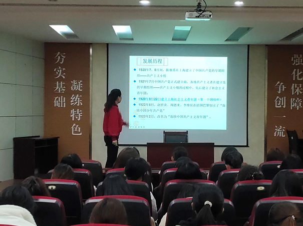 团委书记易凡担任主讲,各班级团支部书记到场聆听。此次团课的主要内容是中国共产党和中国共青团的历史。首先,易凡老师用半个小时的时间,带领各团支部书记回顾了中国共产党自成立以来至今的100年光辉历史。随后,沿着党史的脉络,她详细介绍了中国共青团的发展历程,并梳理了历次团代会的开展情况,强调了中国共青团的性质,要求广大团支部书记要熟知团的历史,在实际工作中认真贯彻上级团组织的各项方针政策,推进落实相关工作,进一步加强对青年团员的思想引领。课程最后,易凡老师安排了团支部近期评优评先的相关工作。