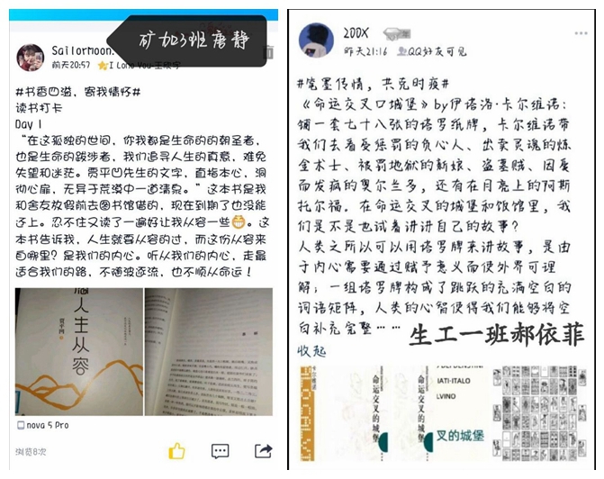 活动开始后,学生们积极报名参与,加入活动QQ群,通过QQ空间、朋友圈等社交平台连续三天分享读书心得,推荐喜爱书籍。工艺19-2班陈宣成读《毕淑敏散文集》有感,生活中总有一种女孩,容颜清丽却不艳色妖娆,这种由内而外的东西,就是气质。矿加19-3班唐静谈《愿人生从容》,人生从容来自内心,我们应该听从自己的内心,走最适合自己的路,不随波逐流,也不顺从命运。同学们发表自身心得,阅读他人感悟,感受书墨带来的安宁与恬淡,遨游在书籍的海洋里。经过角逐筛选,陈宣成等九名学生的读书心得获评本次活动优秀奖。