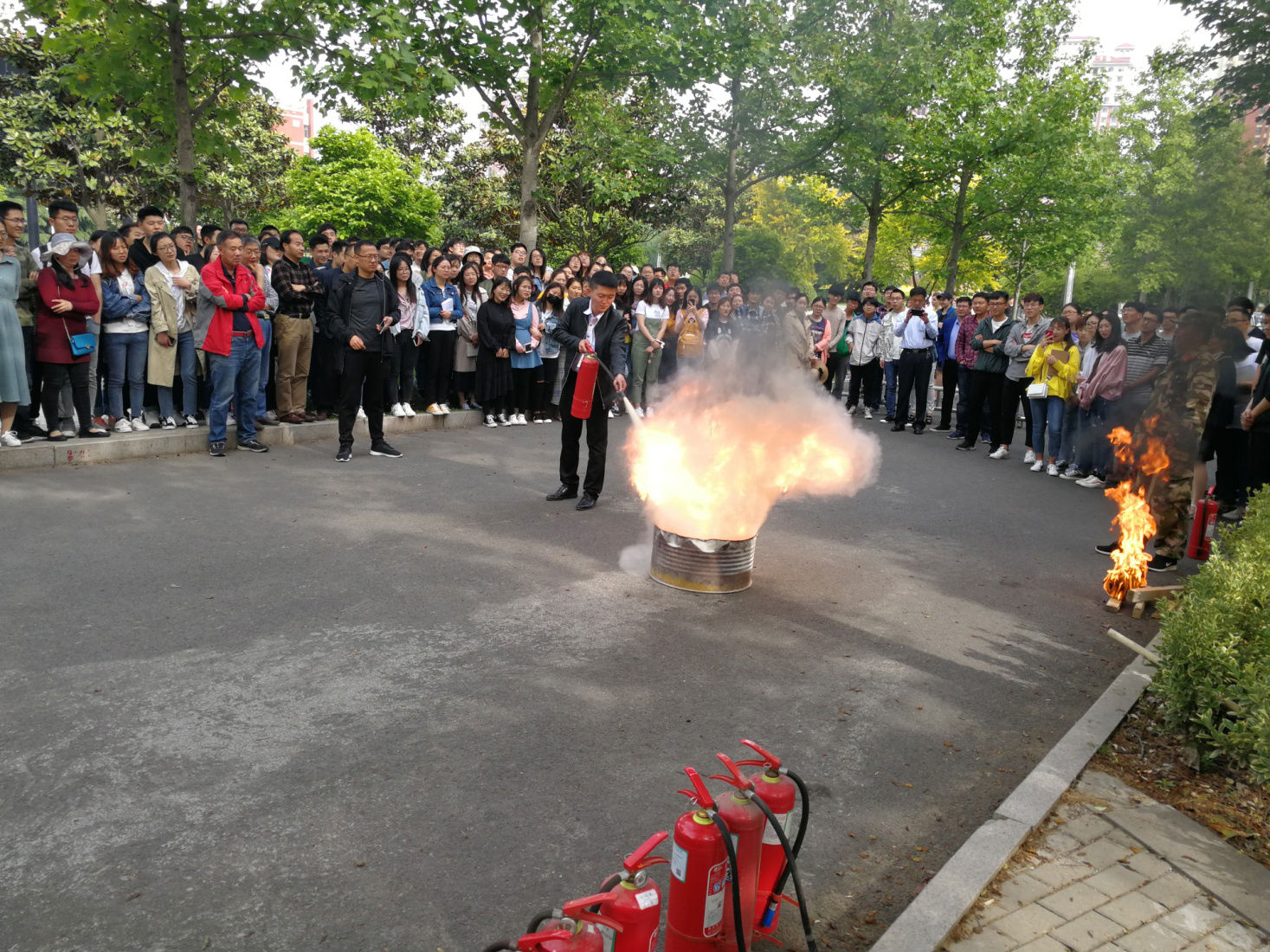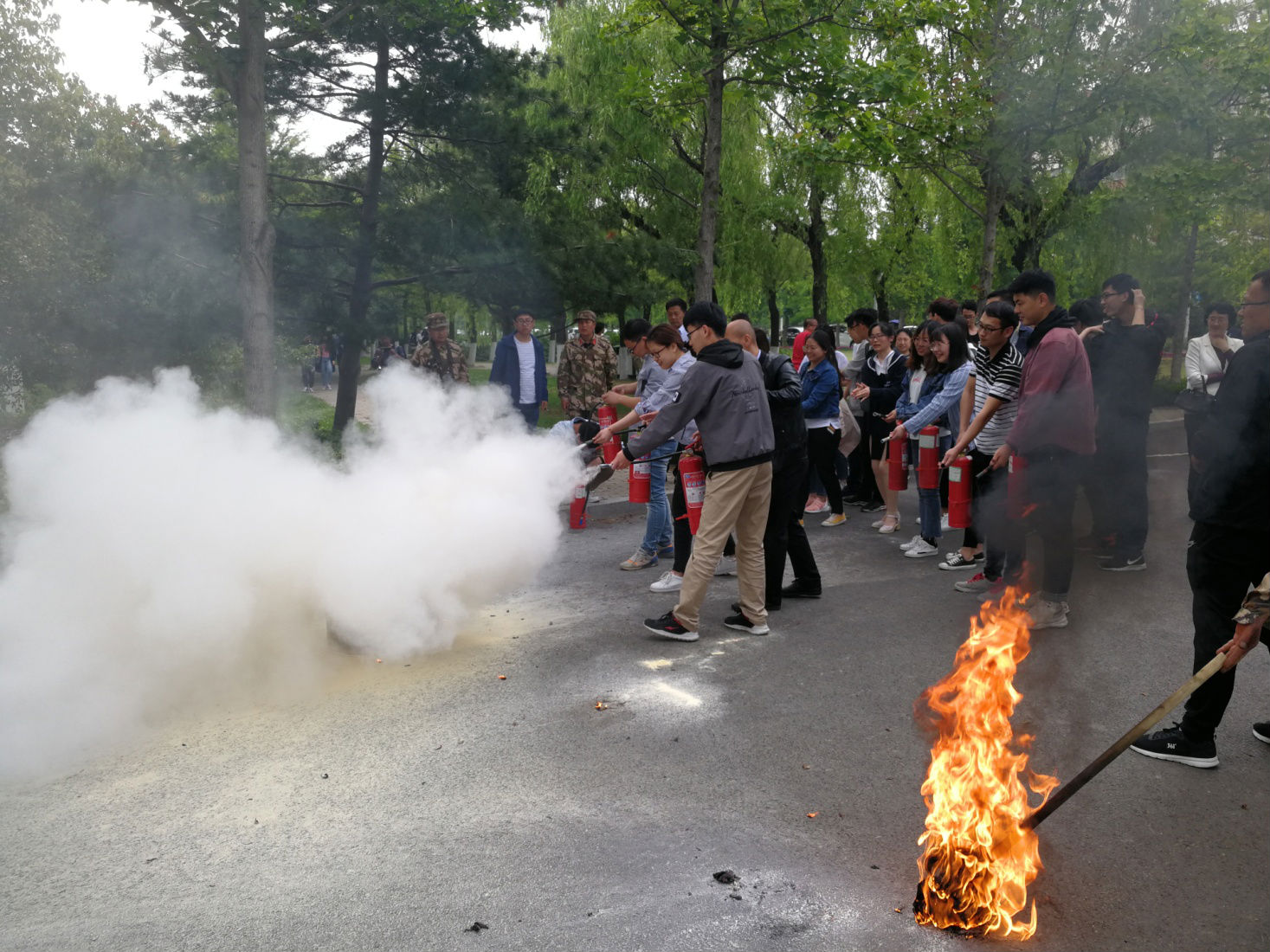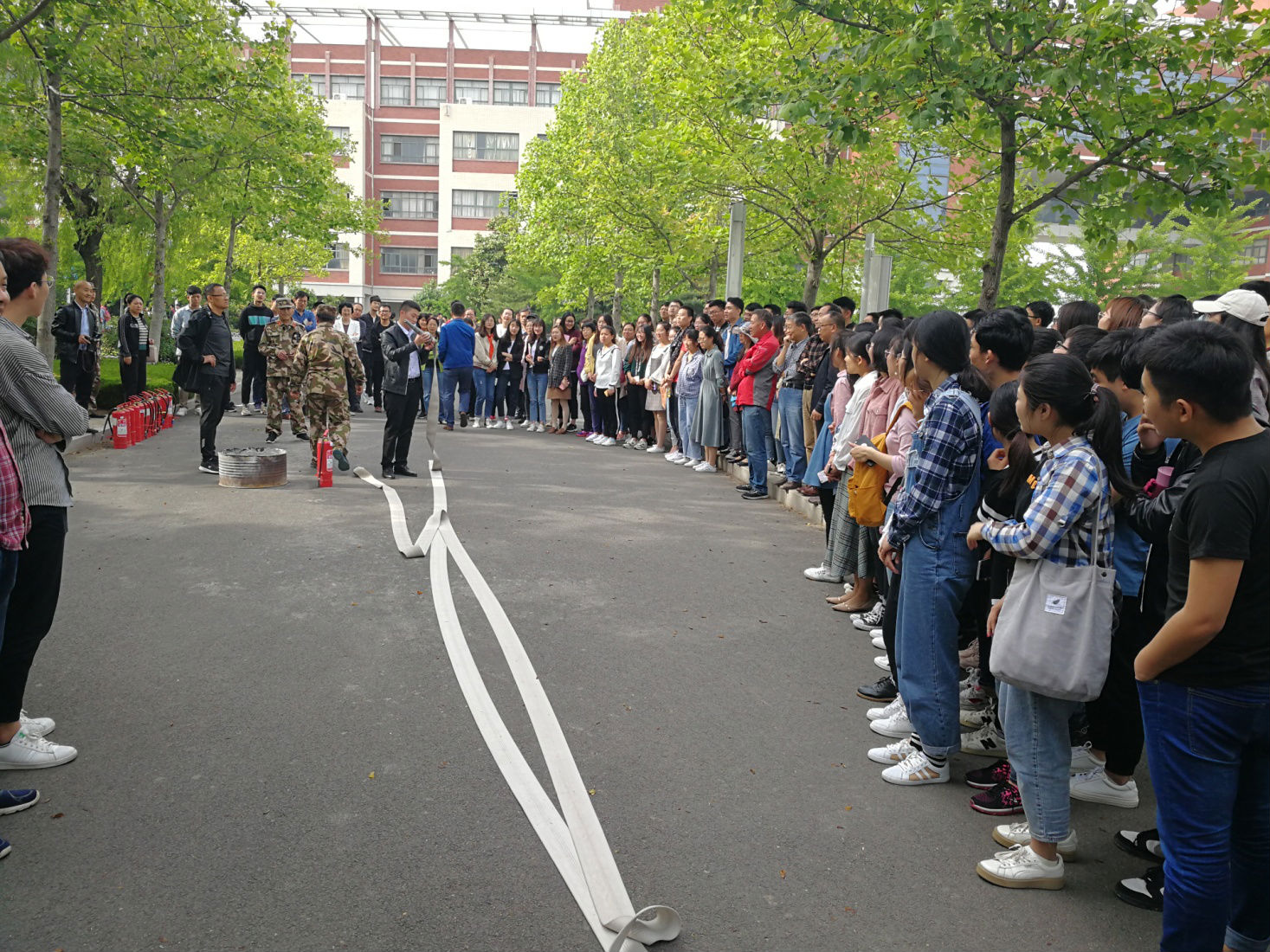 师生现场听取了干粉灭火器、消防水带等的使用方法、操作要领讲解,观摩了消防灭火示范,并轮番参与了灭火演练。