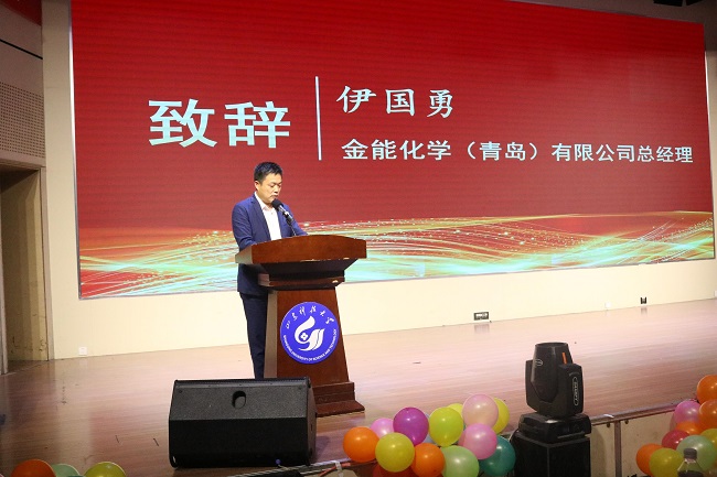 伊国勇代表金能化学(青岛)有限公司向全体毕业生致以最诚挚的祝福,向蝉联校运会“双冠王”的现场足球成绩