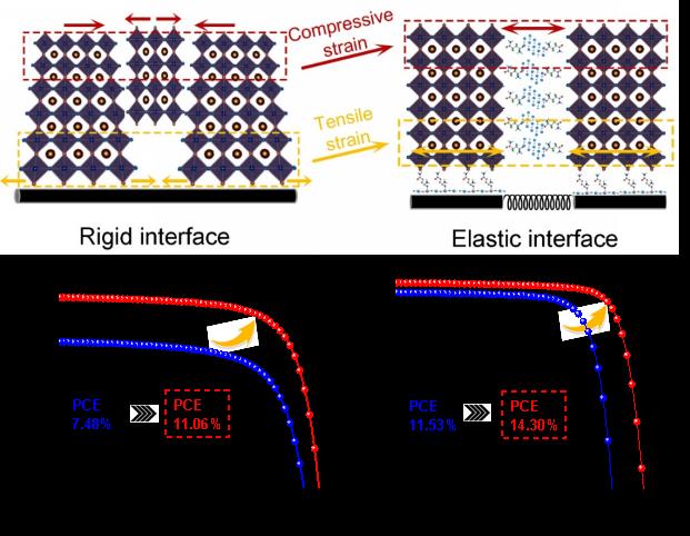 近年来,钙钛矿太阳能电池由于具有优异的光电转换效率、成本低、制备简单等优势,迅速成为未来最具应用潜力的光伏技术之一。如何提升钙钛矿薄膜的质量是获得高效稳定电池器件的关键。然而,由于晶格失配、热效应以及外部环境刺激下引起的晶格应力极易诱导产生大量的空位点缺陷以及位错,其中,拉应力的存在会造成晶格膨胀,降低离子迁移势垒,加速电池内部的电荷复合以及钙钛矿薄膜的降解过程。在钙钛矿薄膜生长过程中,钙钛矿与基底之间的热膨胀系数差异大,往往是诱导大量界面应力的主要原因之一。与常规有机-无机杂化钙钛矿薄膜相比,全无机钙钛矿薄膜具有两个明显的特性:第一,热膨胀系数高;第二,相转变温度高。因此,全无机钙钛矿薄膜中残余应力在理论上将远高于有机-无机杂化钙钛矿薄膜,不利于电池效率和稳定性的提升。