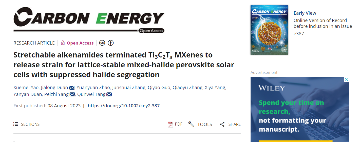 段加龙副教授(学术教授)、唐群委教授等人在全无机钙钛矿太阳能电池领域取得最新进展,相关成果以“Stretchable alkenamides terminated Ti3C2Tx MXenes to release strain for lattice-stable mixed-halide perovskite solar cells with suppressed halide segregation”为题发表在权威期刊Carbon Energy上(中科院Top一区,影响因子:20.5)。