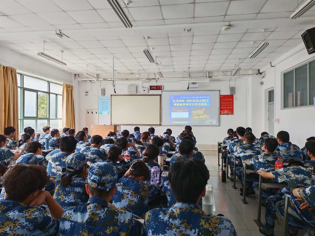 2025级全体新生在军训期间集体观看了《从大阅兵看人民军队武器装备的建设发展》专题纪录片。本次入学教育活动作为学校思想政治教育工作的重要组成部分,通过展现新中国成立以来17次大阅兵的宏伟画卷,为全体新生上了一堂生动的爱国主义教育课。