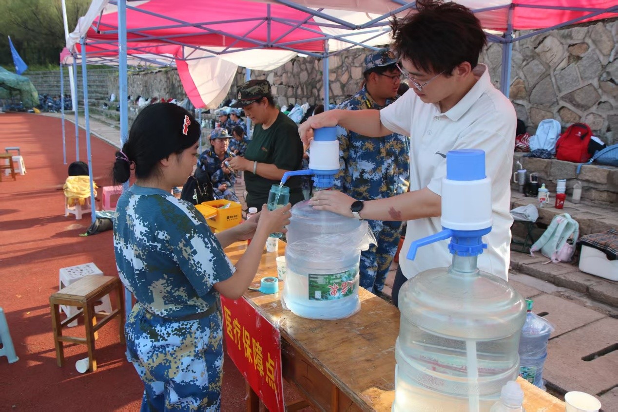 在训练场周边设置多处 “饮水补给点”。补给点不仅配备了大容量桶装水及手动按压式取水器,还安排志愿者协助新生接水、续水,有效避免排队拥堵,确保每位同学能够在训练间隙及时补充水分。
