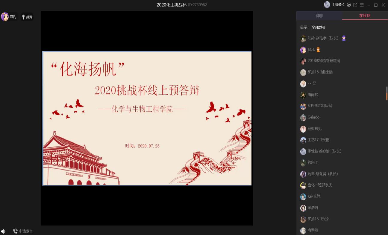 举行“化海扬帆”2020年挑战杯线上预答辩活动。本次活动由团委书记易凡主持,各团队参赛队员、指导教师代表参加此次线上预答辩。活动开始,易凡老师介绍了本次线上预答辩的目的、流程。随后,各团队答辩队员按照顺序依次进行了各项目的展示汇报,最后,易凡老师不但就各位同学的答辩表现给出意见和建议,而且认真听取了各团队关于比赛演练的进一步计划。本次线上预答辩活动,帮助参赛团队认识到了项目中的不足,指明了下一步改进的方向,提高了同学们竞赛答辩的应对能力。各参赛团队感受到了现场足球成绩