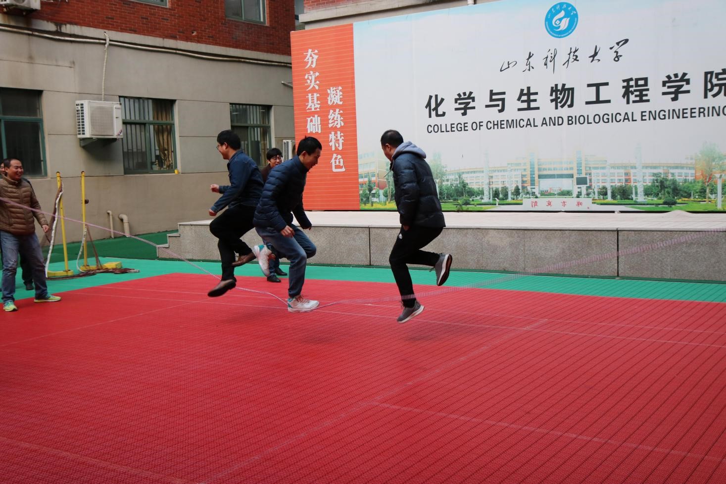 此次活动分为六支队伍:机关队、矿加系队、化工系队、应化系队、生工系队、实验中心队,每支队伍由2名摇绳员和5名跳绳员组成。大家精神饱满,斗志昂扬,尽管寒风凛冽,却不能减退老师们的运动热情。经过短暂的热身和场地适应,活动正式开始,现场加油声、呐喊声、欢笑声此起彼伏,迅速点燃了老师们运动的热情和挑战自我的勇气,广场内呈现出一片快乐、健康、向上的景象。