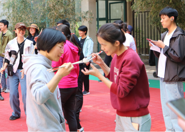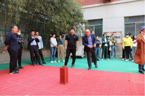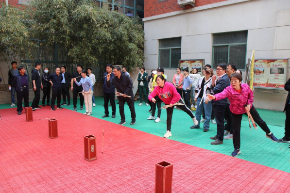教职工们自由组合,5人一队,以团队的形式进行比拼。投壶现场,一支支道具箭从手中抛出,在空中留下一道优美的弧线,大家都期待着箭入方壶。运输小队项目是用箭夹住乒乓球进行接力赛,考验的不仅是平衡能力,更是团队合作。这两个项目充满了趣味,教工们兴致勃勃,竞相踊跃参加,一展身手。运动会不但是智慧和体力的角逐,更是团结和协作的比拼。参赛教职工们兴致盎然、斗志昂扬,现场气氛热烈,掌声笑声不断,其乐融融。