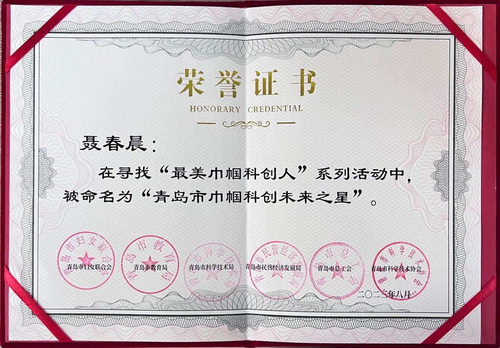 聂春晨博士获评“青岛市巾帼科创未来之星”荣誉称号。