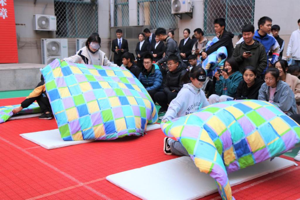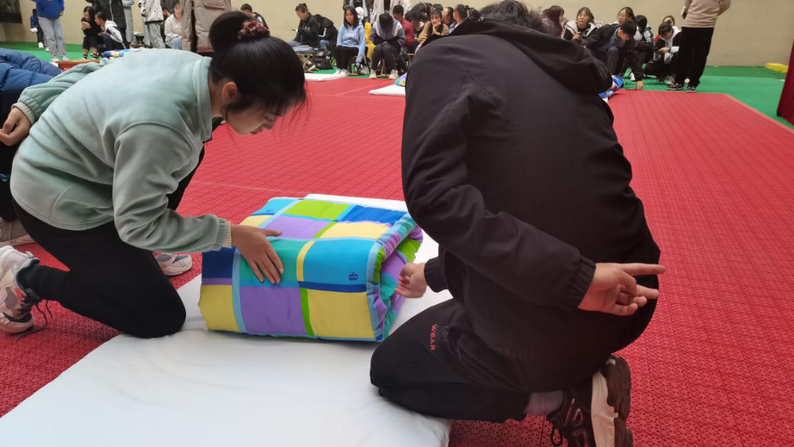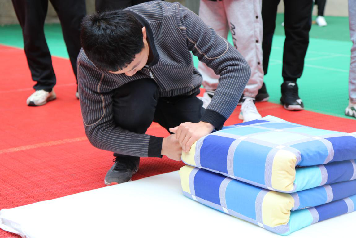 比赛共分为四轮,分别为班级个人叠被、个人蒙眼叠被、男女合作单手叠被、个人完成指定动作叠被。比赛开始前,各班列队整齐,喊出响亮的口号为自己加油助威。参赛人员个个蓄势待发,开始口令一下,选手们立即行动,全神贯注,动作干净利落,手起“被”落间,原本乱作一团的被子变成了一个个方正的豆腐块。现场气氛热闹非凡,场上选手比拼紧张激烈,大赛中的游戏环节则加强了与观众的互动,为比赛增添了欢乐与轻松。由现场足球成绩