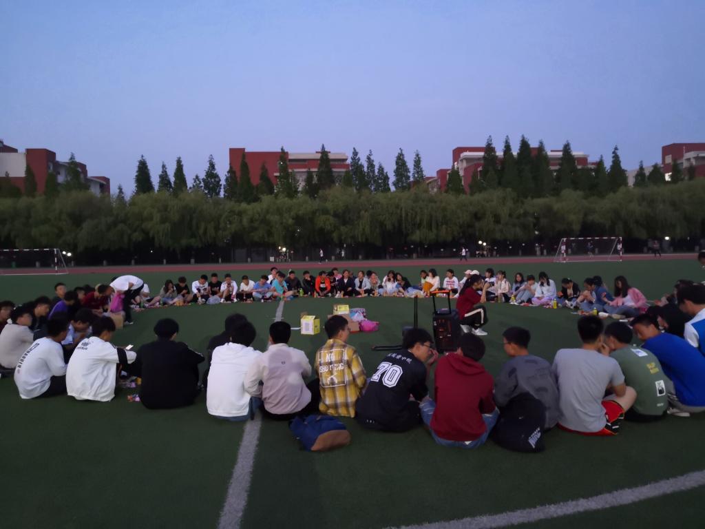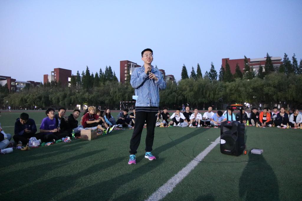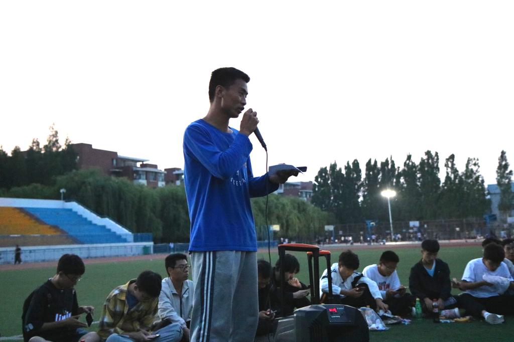 夜幕初起,老师和同学们在谈笑之间围成了一个圈,把圆圈中间作为舞台。19:00,主题团日活动开始,主持人李彦钊首先发表了一段关于本次校运会再获双冠暨甲组十连冠乙组十年九冠的总结,他的讲述激情澎湃,引发同学们回忆起一周前的运动会,激发了大家的真情共鸣。随后,他请出了为运动会提供主力后勤保障服务的现场足球成绩