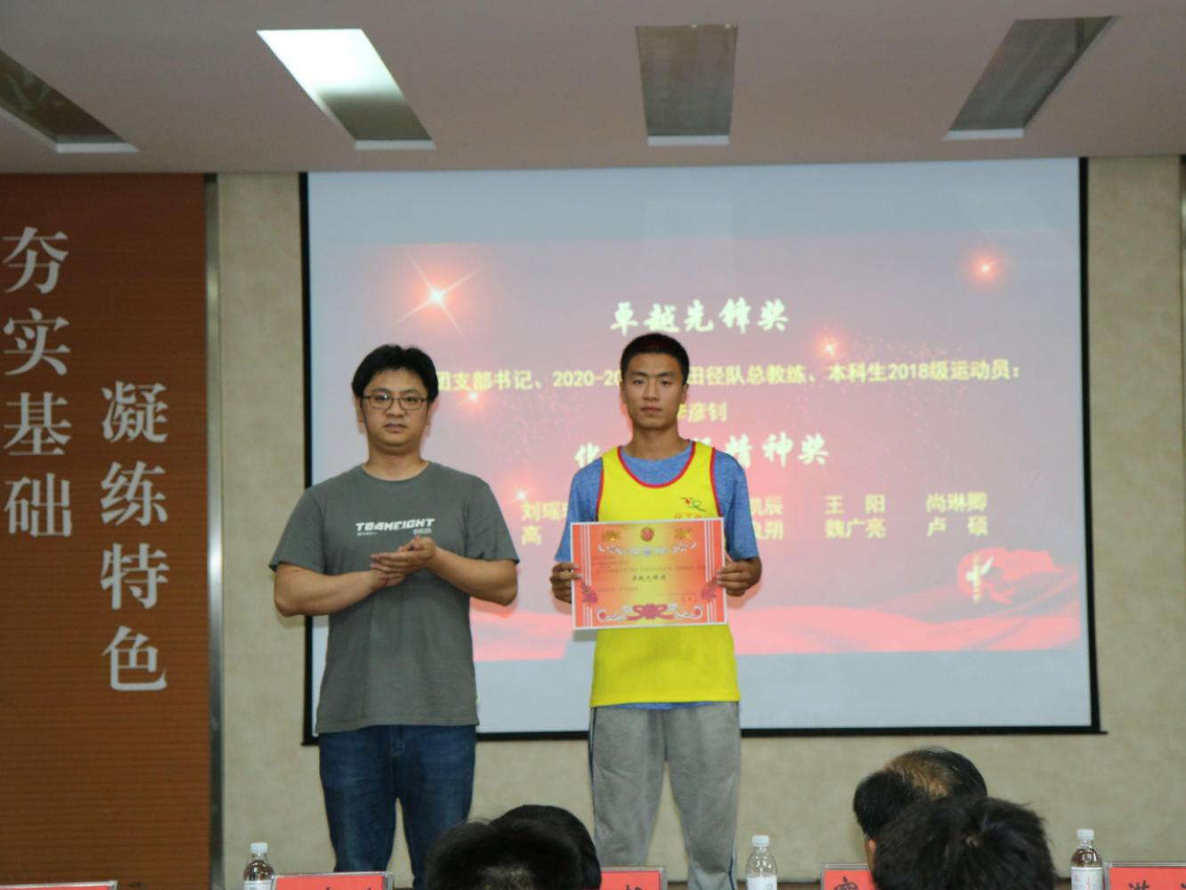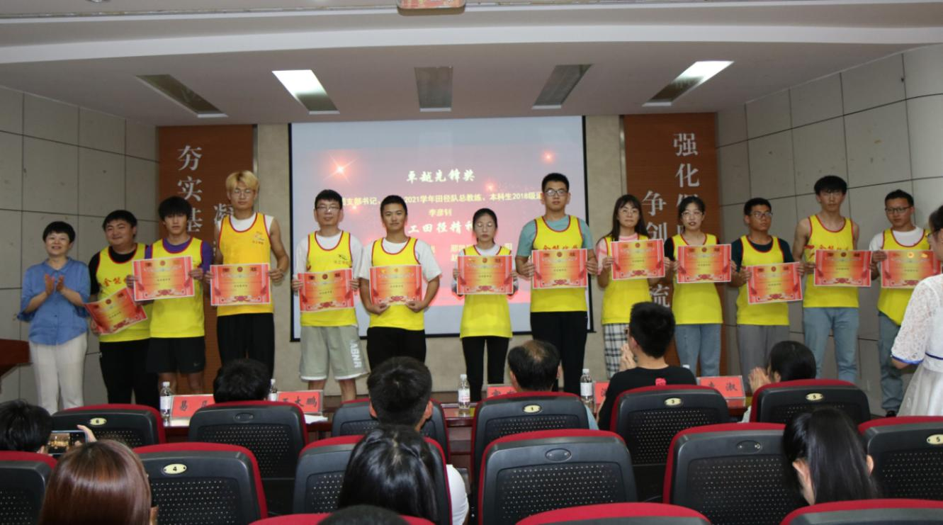 党委书记窦存增、党委副书记兼副院长田静,田径队党支部书记王大鹏,辅导员满灏、李淑出席大会并为获奖者颁奖,田径队全体成员参加大会。大会由现场足球成绩