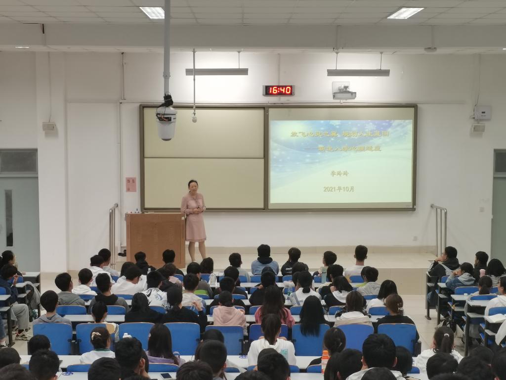 心理健康教育负责老师李玲玲主讲,全体大一新生到场聆听。