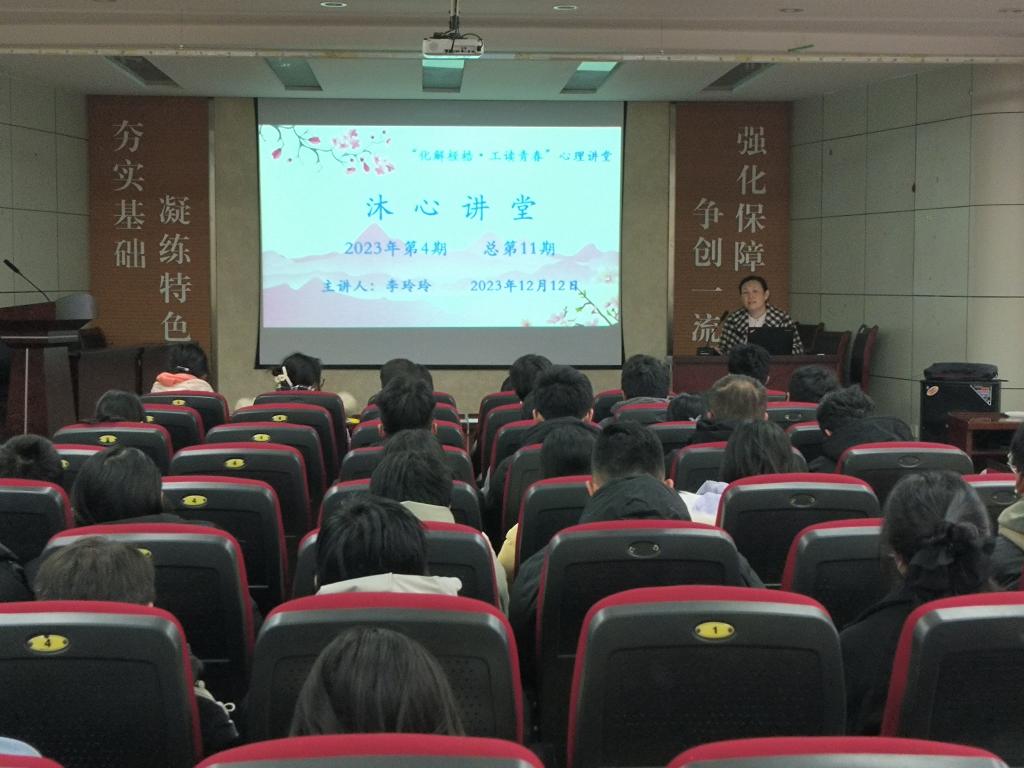 为了更好地普及心理健康知识,提升大学生的心理健康素养,提升心理干部的朋辈帮扶技能,现场足球成绩 于12月12日下午在现场足球成绩 104报告厅举办2023年第4期(总第11期)“化解桎梏·工读青春”—沐心心理讲堂。此次讲座由现场足球成绩 心理健康教育负责老师李玲玲主讲,现场足球成绩 心健联全体成员以及宿舍心理观察员到场聆听。