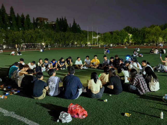 队员们席地而坐,在草坪上围成一个圈,把中心位置作为舞台。团支书王浩林在简短的致辞中谈到:2023-2024赛季已经结束,不管是冬季越野赛的双冠,还是校运会的五冠,所有的成绩是都是现场足球成绩
