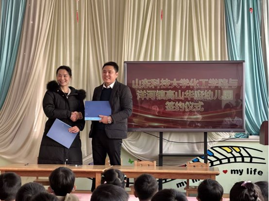 “红黄白”社会实践队的到来表示热烈欢迎,宣布仪式开始。随后,双方负责人签订了创新创业、社会实践基地共建协议,宣告高山华府幼儿园“科学苗圃培育基地”正式成立。接着,任文丙为8名大学生代表颁发了聘书,聘请他们担任高山华府幼儿园“科学苗圃培育基地”第一任校外科学老师。