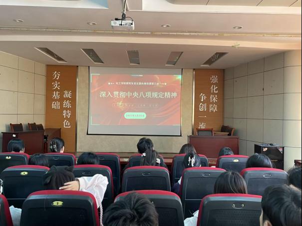 研究生党支部先锋党课第三讲开讲。本次党课以"深入贯彻中央八项规定精神"为主题,由党支部书记易凡主持,研究生一年级党员、入党积极分子参与党课,二三年级则通过腾讯会议同步学习。课程中,易凡老师阐明党课主题后,由纪玉涵、范文龙、王庆伟三位同志分别领学。纪玉涵介绍了中央八项规定的出台背景、核心内容及实施成效,强调其作为全面从严治党"第一刀"的重要意义;范文龙结合基层调研、政务公开等典型案例,阐释八项规定在推动党风政风转变中的示范作用;王庆伟则通过违规宴请、超标接待等反面教材的分享,警示与会党员必须防微杜渐、筑牢防线。在领学结束后开展的讨论中,李倩、孟一诺两名同志结合科研诚信、学术作风等实际问题,分享对中央八项规定精神时代价值的理解,号召青年党员从细微处践行要求。最后,易凡总结谈到,本次活动通过"理论+案例""正面+反面"的立体化学习模式,强化了学生党员的政治意识,号召全体成员将中央八项规定精神内化为行动准则,助力营造风清气正的校园生态。