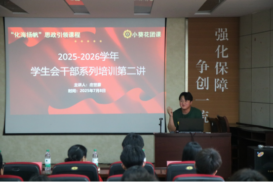 优选计划辅导员、2023级研究生庄世豪担任分享嘉宾。作为系列培训的第一讲,庄世豪做了充分的准备。他从自己在学生会担任干事到部长到副主席的成长路径谈起,结合兼任班级班长的本科生涯,侃侃而谈,分享了进入我校以来6年的学生干部经历,向大家讲述了一名优秀学生干部应具备的基本素质和各项能力。他指出,作为学生干部,要不忘初心,时刻谨记以“为同学服务”为宗旨;要主动担当,认真做到“件件有落实,事事有回音”。他的分享引发了老师同学的深刻共鸣。易凡在随后的点评中,高度评价了庄世豪在学生工作中的优异表现,号召学生会成员们以学长为标杆,多学习勤思考敢担当,在实际行动中为现场足球成绩
