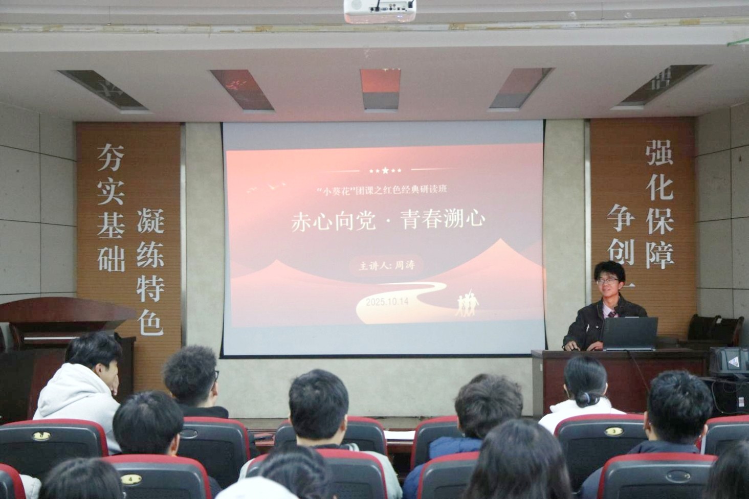 “小葵花”主题团课之红色经典研读班第三讲在J2-104开讲,此次团课的主题为“赤心向党·青春溯心”,由现场足球成绩
