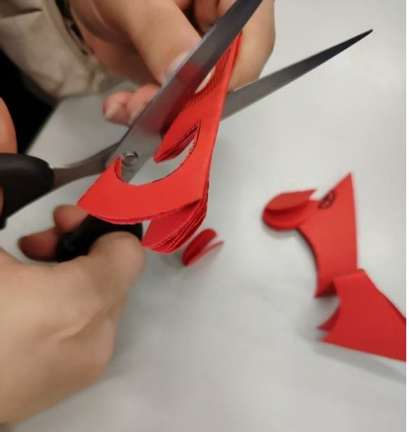 活动现场,社团成员首先从结构化学的角度出发,讲解分子对称性在美学与化学中的重要意义。随后,同学们以红纸为材、剪刀为具,将抽象的化学结构转化为具象的剪纸艺术。苯环的六重对称、水分子的V形构型、晶格的规整排列等经典化学结构,在指尖翻飞中化作一幅幅兼具科学内涵与传统技艺的剪纸作品。