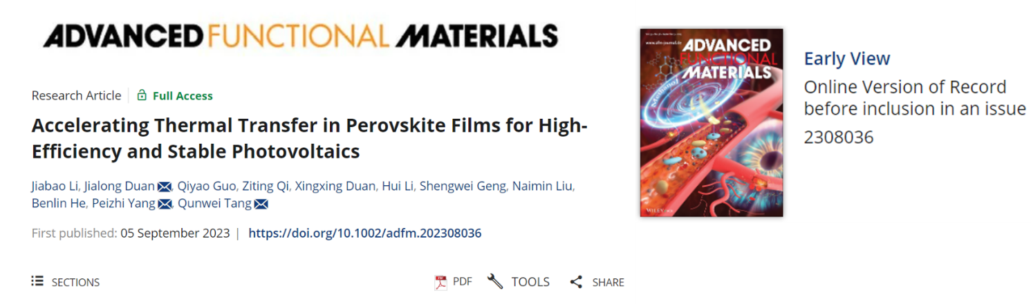 段加龙副教授(学术教授)、唐群委教授等人在全无机钙钛矿太阳能电池领域取得最新进展,相关成果以“Accelerating Thermal Transfer in Perovskite Films for High-Efficiency and Stable Photovoltaics”为题发表在权威期刊Advanced Functional Materials上(中科院Top一区,影响因子:19.0)。