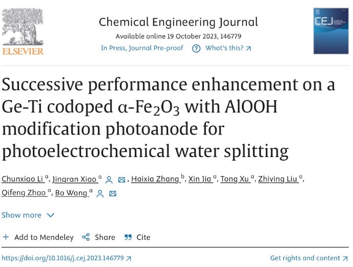 近日,现场足球成绩 肖静冉(学术教授)、王博教授等人在光电催化水分解领域取得最新进展,该文章第一作者为现场足球成绩 2021级硕士研究生李春晓。相关成果以“Successive performance enhancement on a Ge-Ti codoped α-Fe2O3 with AlOOH modification photoanode for photoelectrochemical water splitting”为题发表在国际知名学术期刊Chemical Engineering Journal上(中科院一区Top,影响因子:15.1)。