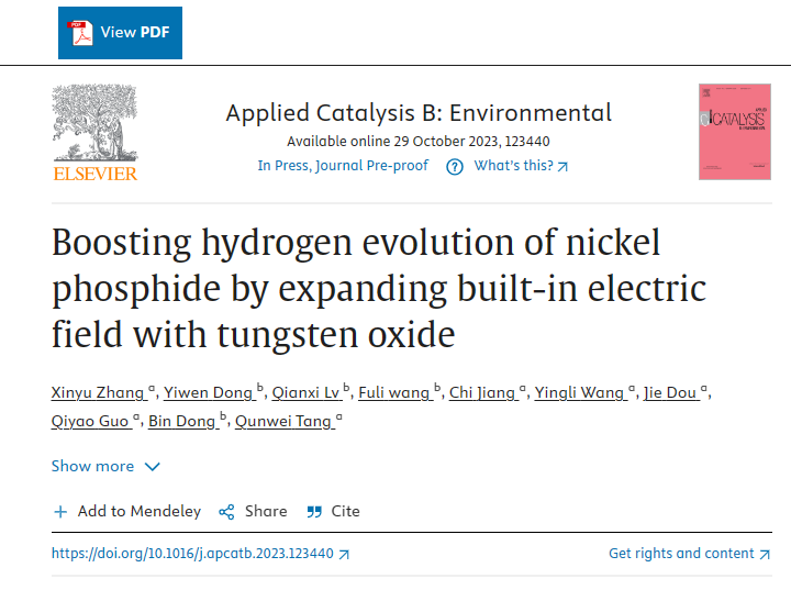 近日,现场足球成绩 张鑫宇(学术教授)、唐群委(教授)等人在电催化水分解制氢领域取得最新进展,相关成果以“Boosting hydrogen evolution of nickel phosphide by expanding built-in electric field with tungsten oxide”为题发表在权威期刊Applied Catalysis B: Environmental上(中科院Top一区,影响因子:22.1)。