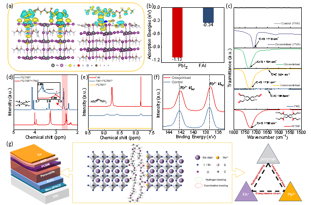 本工作中,开发了一种光诱导原位聚合调节策略,采用PAE和PETMP作为交联剂,聚合单体经紫外光诱导原位聚合在钙钛矿体相中形成三维交联网络。聚合物与PbI₂终端面结合能以及FA⁺的氢键作用能,均强于钙钛矿自身骨架相互作用,使得聚合物与钙钛矿可以实现双锚定作用。此外,光诱导聚合过程与钙钛矿结晶过程同步进行,聚合物梯度分布与薄膜残余应变分布高度匹配,能有效释放薄膜残余应力并抑制离子迁移。该策略的聚合物网络在收缩过程中对晶格施加水平压缩与垂直拉伸力,有效地释放了残余应变,实现了原子尺度到宏观力学性能的协同优化。通过原子级交联释放残余应力策略,钙钛矿太阳能电池最佳器件效率达25.56%,且滞后效应显著降低。未封装器件在85℃氮气环境中连续运行1000小时后仍保持90%的初始效率,远超对照组的62%。