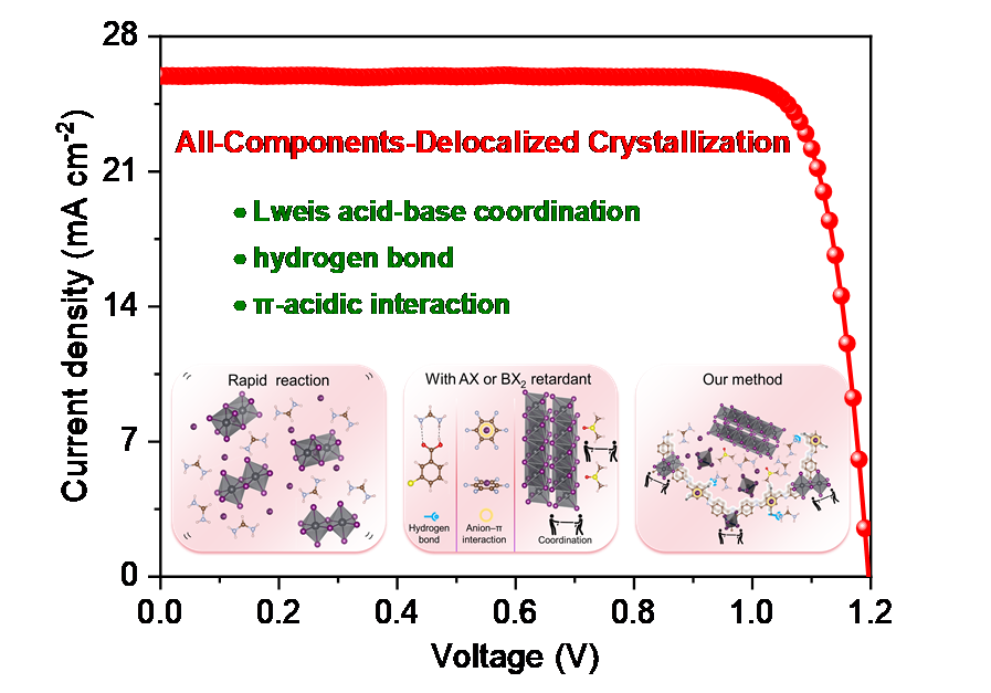 钙钛矿太阳能电池因其出色的光电转换效率而被视为下一代最有应用潜力的光伏技术之一。传统钙钛矿薄膜在制备过程中结晶反应速度过快,往往容易生成不利于器件性能的中间相与各类缺陷。为突破这一瓶颈,团队聚焦于具有可定制化特性的共价有机框架材料,通过对COF非骨架基团(如-F、-H、-OC₂H₅等)进行精准设计,实现了COF与钙钛矿组分之间的多重作用。理论与实验结果表明,相较于其它给电子基团,引入含强吸电子氟原子能够诱导产生局部不对称的电子分布,从而在COF骨架上同步构建三个功能中心:受体单元上的负电性路易斯碱中心、给体单元上的正电性π酸性中心,以及侧链上的氢键中心。这三个功能位点可分别与钙钛矿中的铅离子、游离碘离子及甲脒有机阳离子发生离散式相互作用。借助这种多位点协同作用,研究实现了微观尺度内对钙钛矿组分扩散与结晶行为的精细调控,进而有效钝化缺陷。得益于薄膜质量的显著提升与缺陷的有效抑制,所制备的反式钙钛矿太阳能电池获得了高达26.02%的光电转换效率,并在严苛测试条件下展现出优异的稳定性。该工作为通过分子工程策略调控钙钛矿结晶与缺陷钝化提供了新思路。