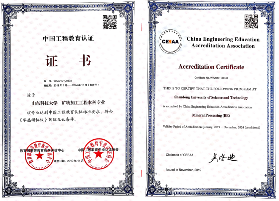 本专业于2019年通过了工程教育专业认证,进入全球工程教育“第一方阵”,并于2020年获批山东省一流本科专业,是目前山东省矿物加工工程领域唯一具有本科、硕士、博士、博士后各层次人才培养条件的专业。经过多年的发展,矿物加工工程专业形成了矿物分选理论与技术、洁净煤技术、矿物材料制备与应用、矿物资源综合利用四个特色鲜明、优势显著的专业方向。依托矿业工程一级学科博士点,本专业2000年获得博士学位授予权,2005年被评为山东省“十五”重点建设学科,2008年被评为山东省特色专业,2008年、2009年分别获得中央与地方共建高校优势学科实验室建设项目资助,2011年被评为山东省“十二五”重点学科,2012年被列为山东省应用基础型人才培养特色名校建设专业,2016年获批为山东省一流学科(矿业工程)和山东省高水平应用型立项建设专业(群)(矿业工程),2019年获批山东省一流本科专业。专业特色课程《矿物加工导论》获批山东省一流本科课程,《选矿学》等五门课程获批山东省精品课程。已建成包括山东省矿山空区治理与环境保护协同创新中心(2017)、“十三五”山东省高等学校重点实验室“矿产资源清洁高效利用实验室”(2017)、山东省煤制甲醇催化剂工程技术研究中心(2011)、山东省高校低碳能源化工重点实验室(2011)、青岛市固体废弃物资源化工程技术研究中心(2013)、青岛市洁净煤技术国际科技合作基地(2015)等多个省市级高层次科研平台。